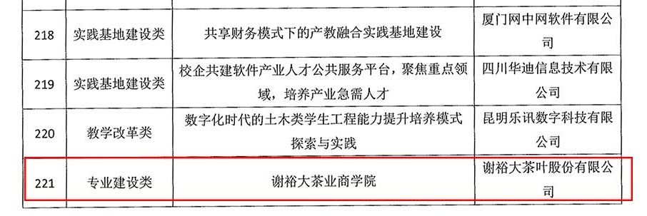 3月10日,在中国高等教育学会主办的2021-2022年度中国高等教育博览会“校企合作 双百计划”典型案例评选中,我校选送的“谢裕大茶业商学院”产教融合和校企合作案例获得提名。