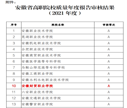 5月2日,在安徽省教育厅颁布的《关于公布高等职业教育院校质量年度报告(2021)审核结果的通知》中,bat365官方网站质量年度报告(2021)荣获A档。