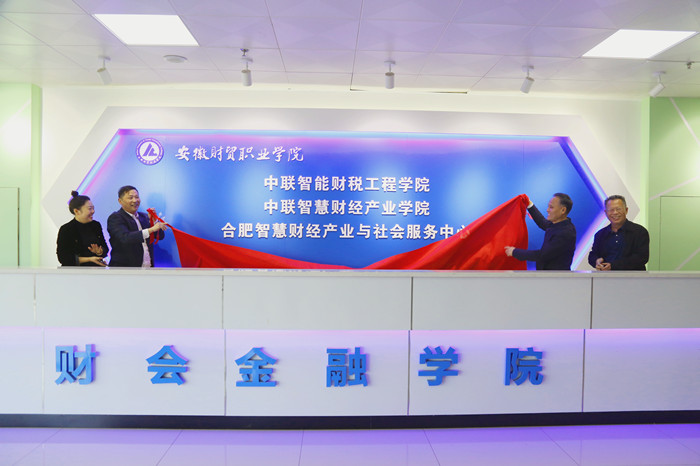 11月16日,学校财会金融学院与中联集团教育科技有限公司举行共建“智能财税工程学院”揭牌仪式。学校党委书记张志祥,党委副书记、校长刘银国,中联集团教育科技有限公司安徽省负责人吴胜兵、章晓东、黄琳,安徽省代理记账行业协会会长余雪,中兴财光华会计师事务所合伙人、安徽分所常务副所长方国权,教务处、财会金融学院负责人出席会议,全国财经职业教育集团理事长、全国财政行业职业教育教学指导委员会副主任、中国商业会计学会职业教育分会会长赵丽生,中联集团教育科技有限公司董事长杨尚想以及省内兄弟院校领导与老师等线上参加揭牌仪式。