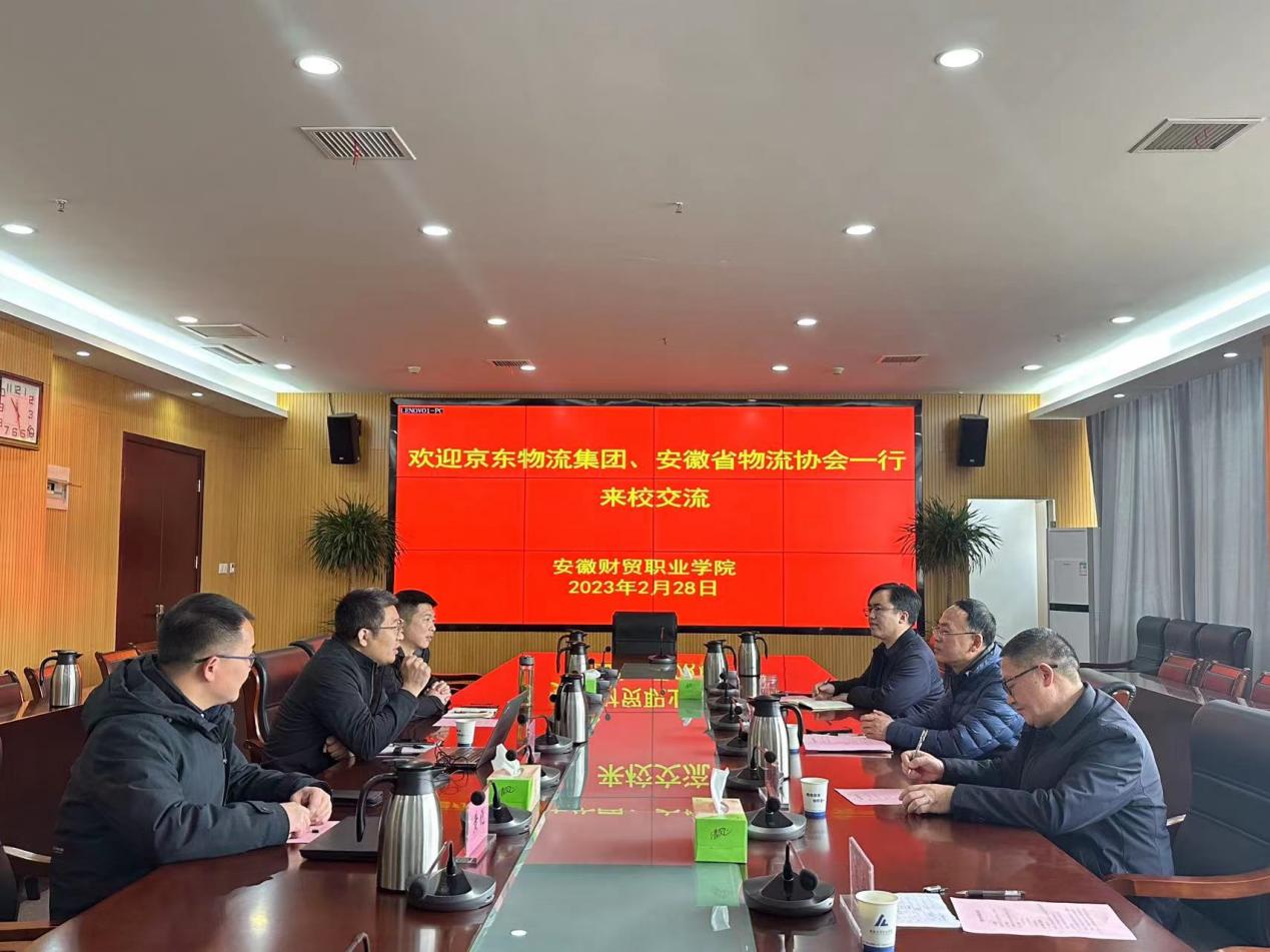 2月28日,京东物流教育华北区总经理赵利清、安徽省物流协会培训中心主任尹道鹏等一行3人来校洽谈校企合作建设乡村振兴产业学院事宜,座谈会在行政楼204举行。学校党委副书记、副院长何翔,经济贸易学院负责人参加了本次会议。