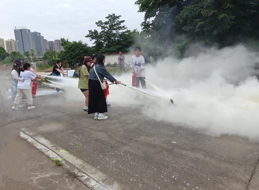 讲座结束后,安全管理处立即开展了模拟会场发生火灾的场景,进行疏散逃生演练。参会人员认真对待、迅速反应,确保逃生演练活动规范有序、紧凑高效。参会人员在逼真的模拟火场环境中提高了应急逃生处置能力,培养了应对突发情况的冷静心态,接受了一次全面有效的锻炼。在随后举行的消防技能实操中,参训师生沉着冷静,严格按照学到的灭火步骤和方法,轮流操作使用灭火器进行油盆灭火。通过亲身体验,参训师生很快就熟练掌握了灭火器的使用方法。