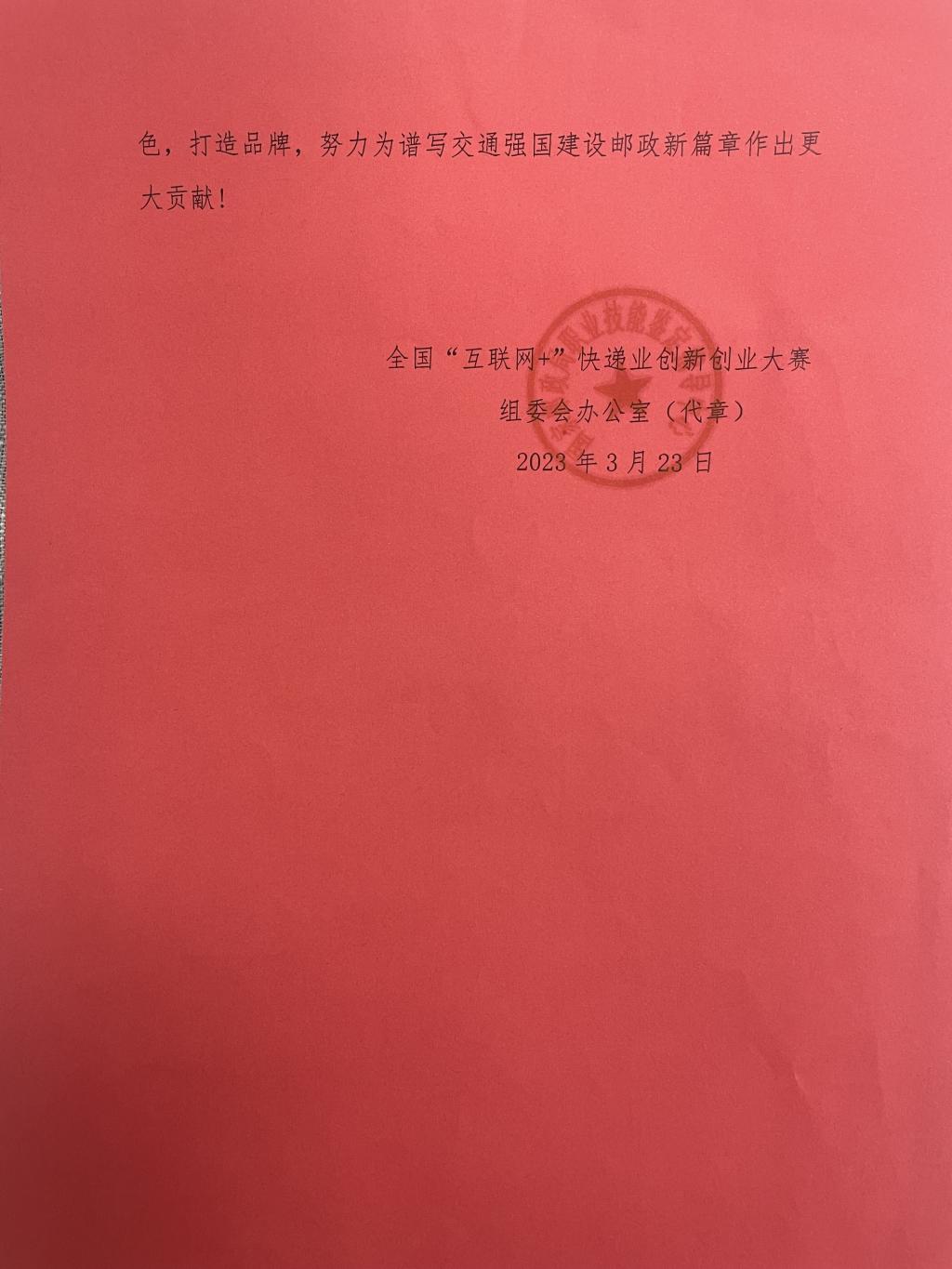 全国“互联网+”快递业创新创业大赛组委会办公室向学校致感谢信