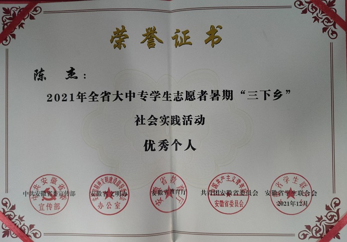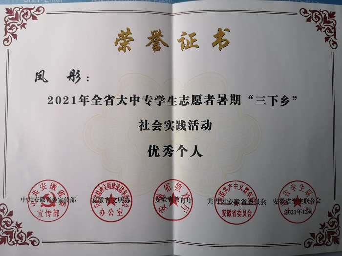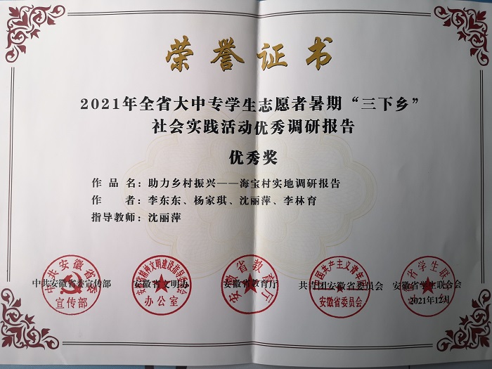 近日,在安徽省大中专学生志愿者暑期文化科技卫生“三下乡”社会实践活动评选中,财会金融学院农旅志愿汇-走进长丰马郢团队荣获“优秀实践团队”、《助力乡村振兴-海宝村实地调研报告》荣获“优秀调研报告”、会计1911班凤彤同学、互金2001陈杰班同学荣获社会实践活动“优秀个人”。