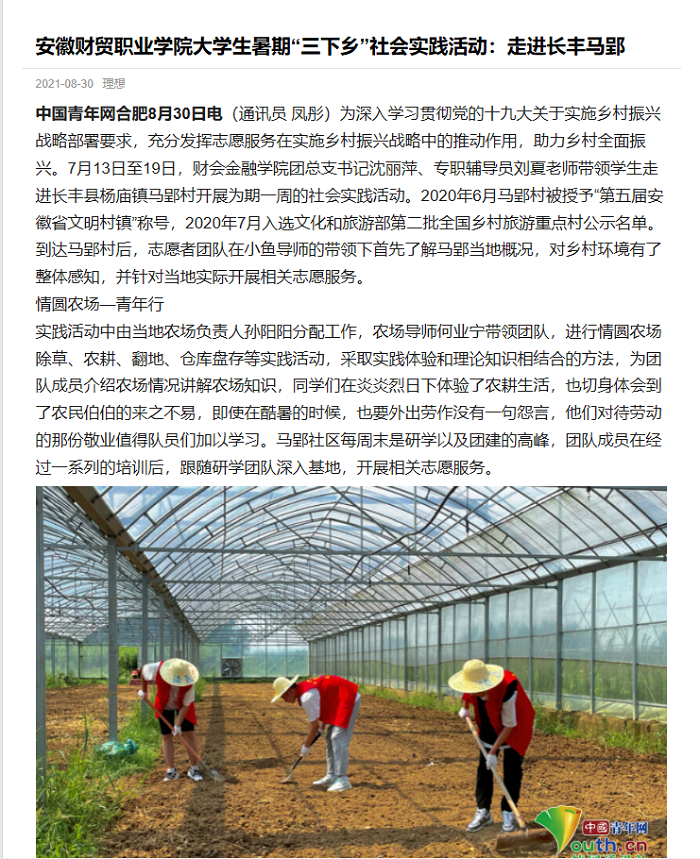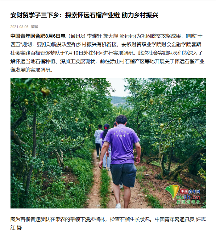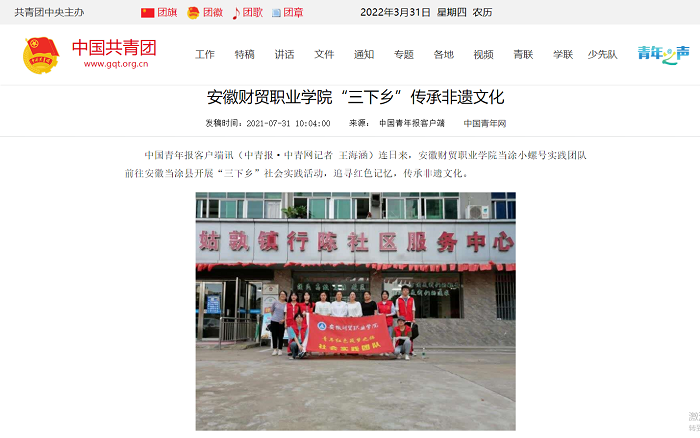 2021年,财会金融学院深入贯彻落实习近平总书记关于青年工作的重要思想,引导和帮助广大青年学生上好与现实相结合的“大思政课”,在社会课堂中受教育、长才干、作贡献,充分发挥党建引领作用,以党建带团建,学院团总支在校团委统一部署和指导下,组建了乡村振兴等8支“三下乡”社会实践重点项目,1700余名师生赴省内各地农村、社区广泛开展大学生暑期“三下乡”社会实践活动,将实地实践观察与思想认识提升相结合,“三下乡”与“返家乡”相融合,增强活动实效性,提升活动影响力。其中,7项重点团队活动纪实受到中国青年网、中青在线、中国青年报客户端、光明日报客户端、安徽日报客户端等各大官方媒体平台报道。