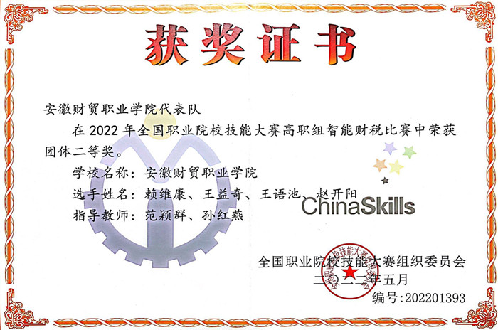 2022年全国职业院校技能大赛高职组智能财税赛项于8月21-23日在广东水利电力职业技术学院成功举办。由我校财会金融学院会计1903班赖维康、财务1901班王益奇、税务1902班赵开阳、税务1902班王语池组成的bat365官方网站代表队,在教师范颖群、孙红燕的指导下荣获国赛二等奖的好成绩。