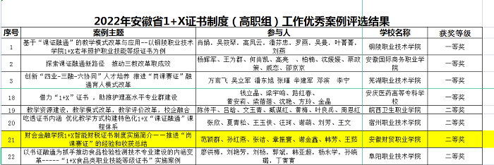 财会金融学院财务管理教研室团队《财会金融学院1+X智能财税证书制度实施简介——推进“岗课赛证”的经验和收获总结》荣获2022年安徽省1+X证书制度(高职组)工作优秀案例二等奖。