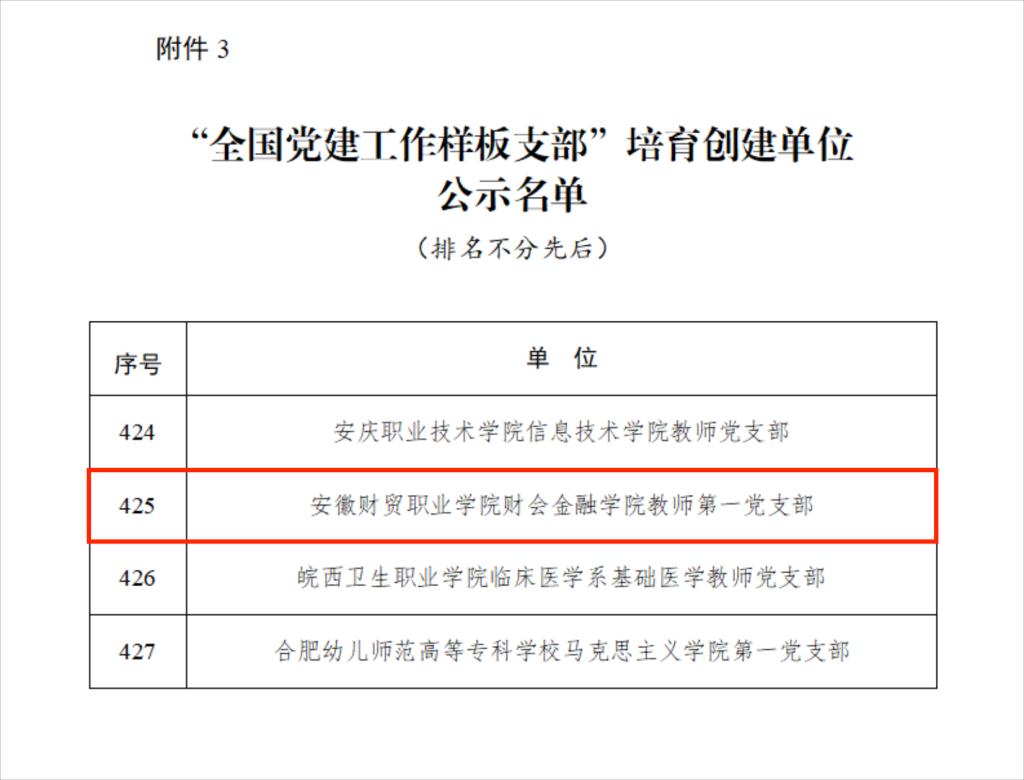 3月18日,教育部公布《教育部思想政治工作司关于第四批新时代高校党建示范创建和质量创优工作遴选结果的公示》,遴选产生了10个全国党建工作示范高校、100个全国党建工作标杆院系、1001个全国党建工作样板支部。我院教师第一党支部入选“全国党建工作样板支部”培育创建单位。