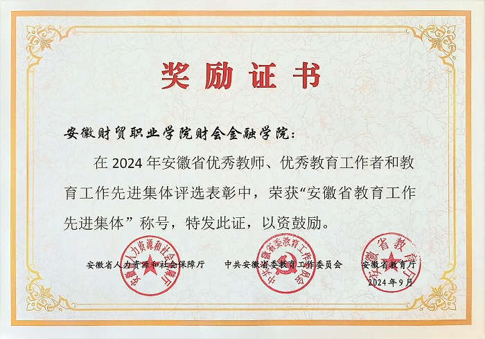 近日,安徽省人力资源和社会保障厅、省教育工委、省教育厅评选表彰了一批安徽省教育工作先进集体及安徽省优秀教师。财会金融学院荣获“安徽省教育工作先进集体”称号。