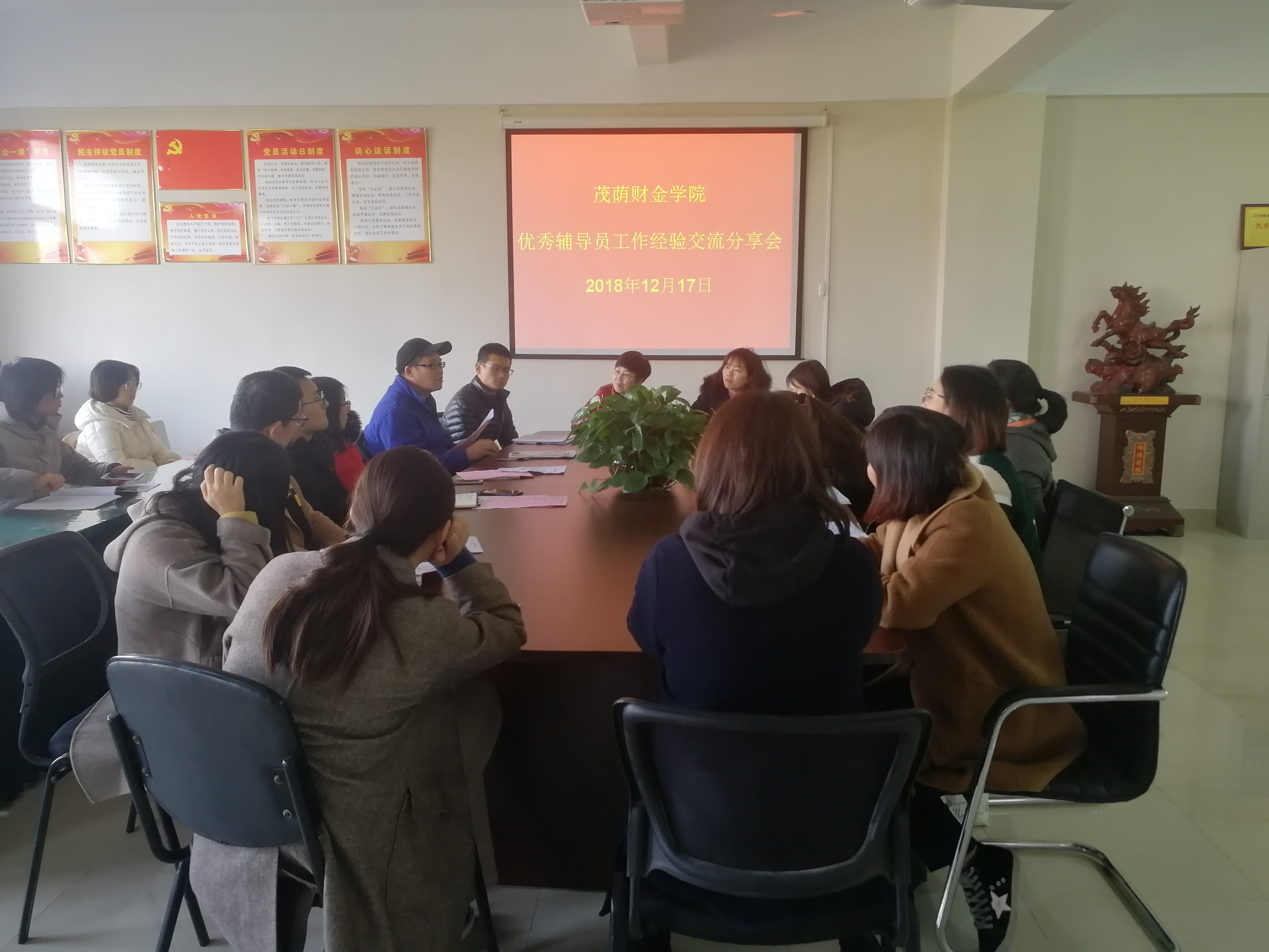12月17日中午,茂荫财金学院在系部办公室召开优秀辅导员工作经验交流分享会,党总支副书记胡宏萱主持会议,全体专兼职辅导员参加会议。