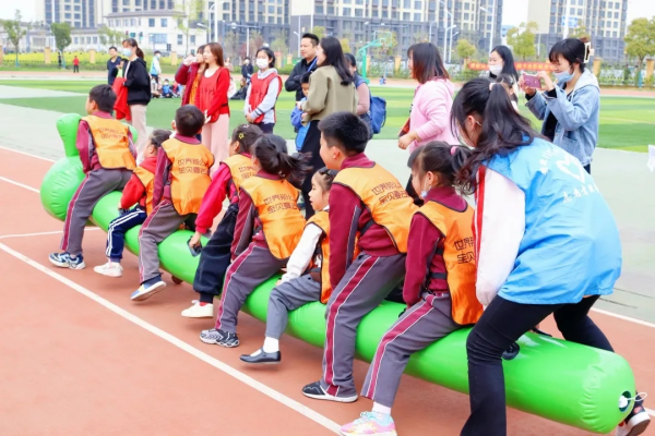 在融合运动会上,学校15名学子先后带领40多名“来自星星的孩子”与合肥安生学校的学生一起参加拔河比赛、行走的毛毛虫、接力风火轮和疯狂彩虹伞等趣味运动,帮助“来自星星的孩子”在运动中建立和发展同伴关系、学习团结互助、学会沟通协作,通过融合的形式,实现共同成长。现场互动温馨又有爱。