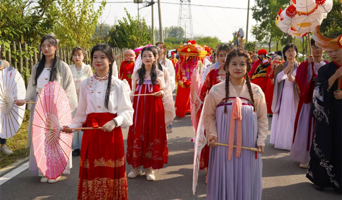 10月14日,“大地欢歌 美好安徽”2023年全国秋季“村晚”示范展示活动在合肥长丰县杨庙镇马郢村举办。财会金融学院志愿者受邀参加本次“村晚”民俗踩街展演并接受央视直播采访。