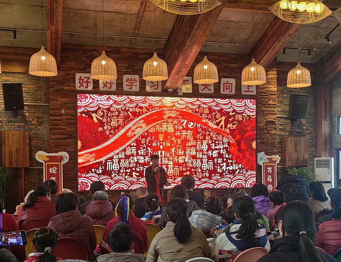 在活动现场,校园十佳歌手吴子乐凭借一曲欢畅跃动的《上春山》,唱出了对新年的殷切期望,台下观众纷纷鼓掌伴奏并齐声附和,共同迎接新春的降临;紧接着,一曲《恭喜发财》唱响了新年的美好祝福,观众席上齐声高呼“恭喜发财”,那一张张朴实的笑脸让乡村的幸福生活变得清晰可感。