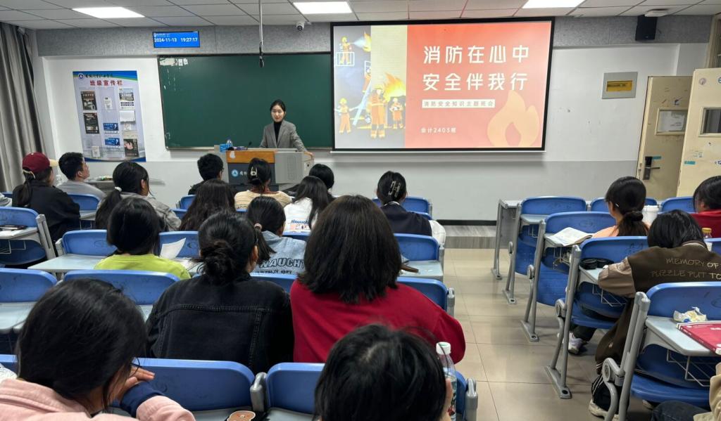 11月13日,在新生安全文明卫生月活动圆满结束后,财会金融学院教师第一党支部持续在学生中推进安全及行为养成教育。通过秋冬季消防安全主题班会,学习了消防安全知识,模拟火灾逃生场景,进一步增强了同学们的消防安全意识和自救能力。同时,班会还强调了文明行为养成的重要性,引导同学们在日常生活中自觉遵守校规校纪,共同营造安全、和谐、文明的校园环境。