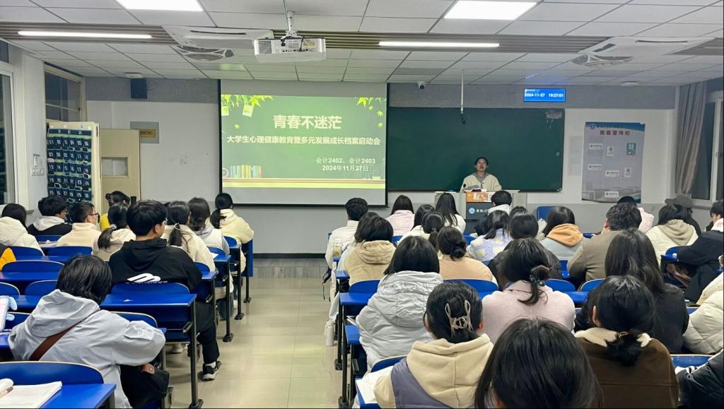11月27日,财会金融学院教师第一党支部在会计2402班和会计2403班开展了心理健康教育暨多元发展档案计划启动会。会上,青年委员、国家二级心理咨询师、二级人力资源管理师任正盼老师,深入剖析了心理发生发展的规律和心理问题根源及解决办法。同时,介绍了多元智力理论和劳动工作的本质以及社会经济发展的基础规律,帮助同学们更好地认识自己与了解社会,鼓励同学们增强个人与社会实际的链接,通过个人目标及发展计划的制定,成长历程和发展轨迹的记录,为未来的全面发展奠定坚实基础。此次启动会后,系列的心理健康主题教育活动也将陆续开展。