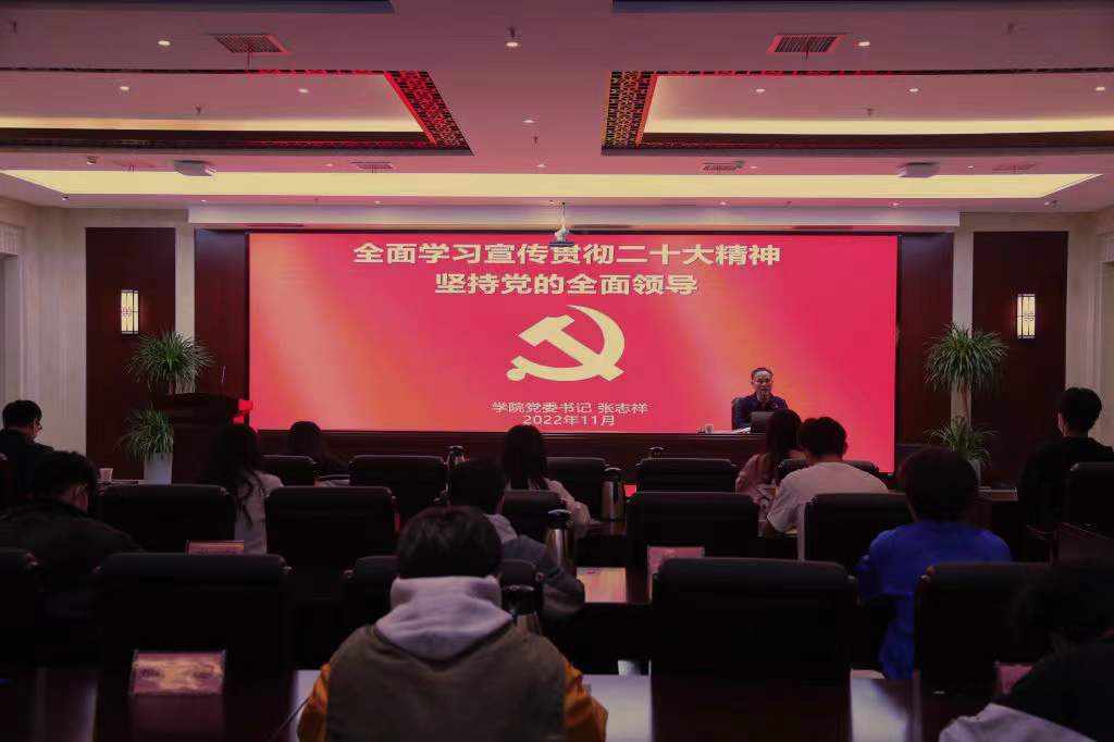 新时代号角催人奋进,新发展蓝图激荡人心。党委书记张志祥立足党的二十大报告,以“坚持党的全面领导”为主题,从为什么要坚持党的领导,怎样理解党的领导是全面的、系统的、整体的,怎样才能做到自觉在思想上政治上行动上同党中央保持高度一致等三个方面,深入浅出地阐释了坚持党的全面领导的重要性和必要性,进一步引导青年学生坚定历史自信、增强历史主动,踔厉奋发、勇毅前行,在新的赶考之路上交出优异答卷。