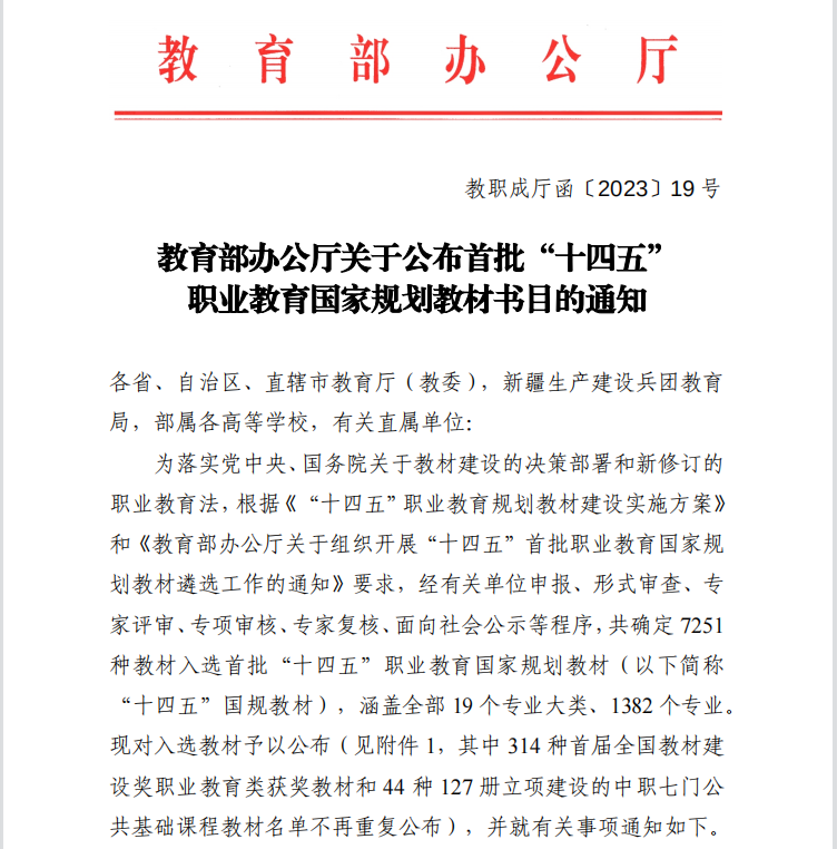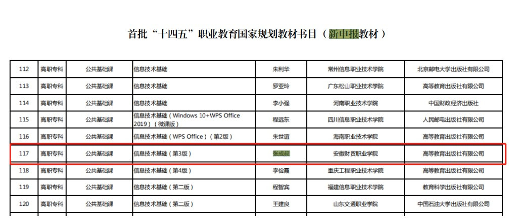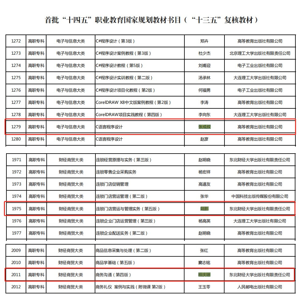 近日,教育部办公厅发布了《关于公布首批“十四五”职业教育国家规划教材书目的通知》,我校张成叔老师主编的两本教材《信息技术基础》(第三版)和《C语言程序设计》、陆影老师主编的《连锁门店营运与管理实务》(第五版)和程庆珊老师主编的《商务沟通》(第四版)四本教材成功入选国家首批“十四五”规划教材。
