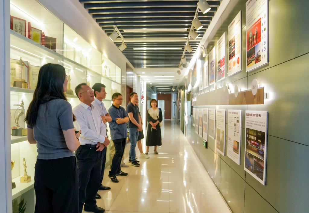 刘银国一行参观了安徽广电集团一楼展厅,并实地走访了旗下金鹃传媒公司、安徽电影集团等多家子公司。走访过程中,刘银国听取了安徽广电集团发展历史的介绍,了解到集团从单一的传统媒体到新媒体多元化发展的清晰脉络。刘银国结合学校近年来所取得的发展实绩和“十四五”专业群建设发展规划,建议校企双方可秉承“五育并举”的教育理念,建构校企双方全方位产教融合发展框架,拓宽校企合作渠道,实现校内教师和企业导师的融合发展,合力为社会培养高素质的新媒体技术技能人才。