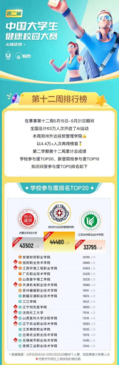 比赛结束后,我校将对全校参赛前100名同学颁发荣誉证书。根据院校的参与度和赛事完成情况最终形成的“校园健康指数”也将作为大体协评选全国“健康校园”的重要依据。(供稿:桑磊;审稿:陈伟)