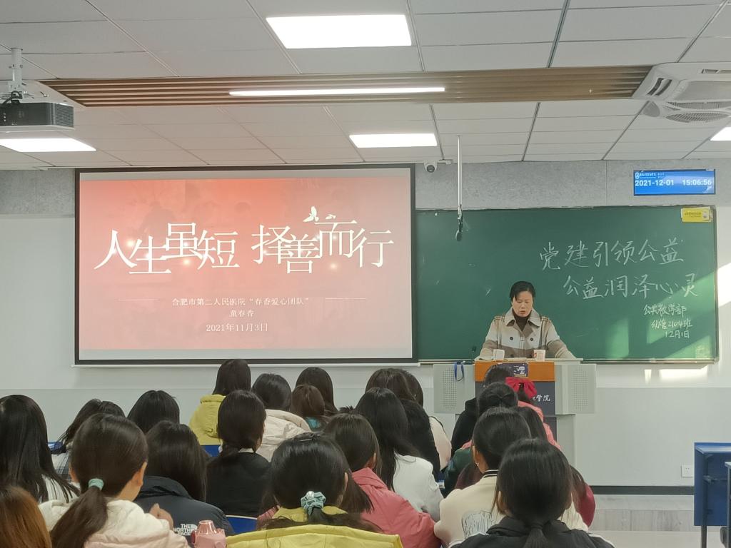 为充分发挥道德楷模的示范引领作用,大力弘扬中华民族优秀文化,教育引导广大学生修身立德、刻苦学习,在国际志愿者日来临之际,12月1日下午3点,由合肥市文明办和公共教学部联合选拔的bat365官方网站公共教学部校外德育辅导员童春香走入幼管2101班,开展了以“党建育人 润泽心灵”为主题的特殊班会。