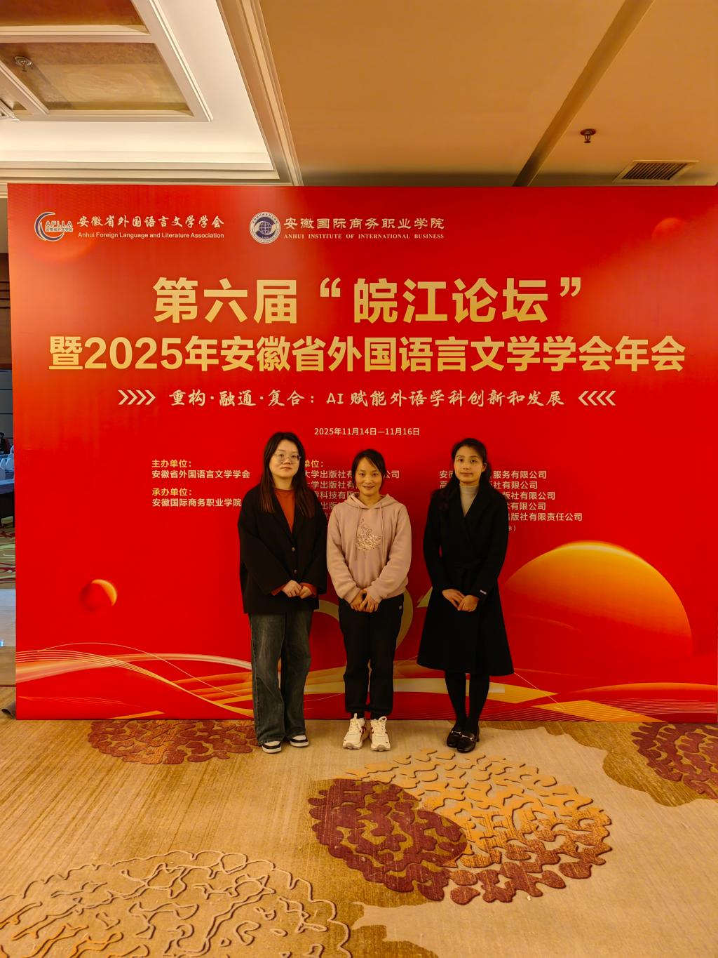 11月14日至16日,由安徽省外国语言文学学会主办,安徽国际商务职业学院承办的第六届“皖江论坛”暨2025年省外文学会年会在合肥隆重召开。省内外高校的外语专家学者以及来自一线的大中小学教师三百余人齐聚合肥,共话外语学科建设,为中国式现代化,美好安徽建设凝聚智慧力量。我校公共教学部外语教研室主任秦志超,教师蒋廉、刘君参会学习。