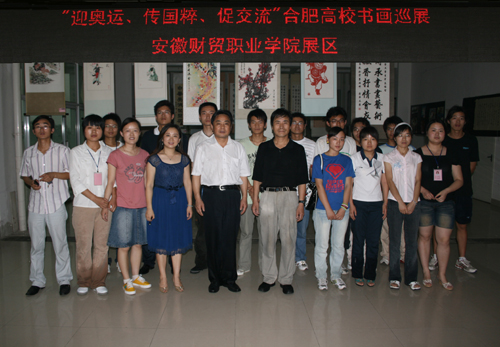 [dvnews_page] 5月27日,“迎奥运 传国粹 促交流”合肥高校书画巡展在我院行政楼一楼隆重开幕。院党委副书记毛礼明、院团委副书记倪晶晶、电子商务系副主任廖新、院书画协会指导老师宋凌云参加开幕式,并与书画协会会员合影留念。