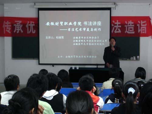 此次书法讲座旨在弘扬和继承中华民族的优秀文化传统,丰富同学们的课余文化生活,提高同学们的书法理论知识水平,同时也为院书画协会在五月下旬承办的“迎奥运 传国粹”合肥高校书画巡展活动作了准备。