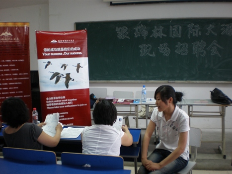 6月17日下午,银瑞林国际大酒店来我院现场招聘旅游管理专业顶岗实习生。在给同学们进行了简要的企业介绍后,酒店行政总监吴元翠女士及招聘部张经理、培训部文经理与同学们进行了面对面的交流,根据同学们的求职意向作了初步的岗位安排,不少同学成为酒店录用的管理培训生。