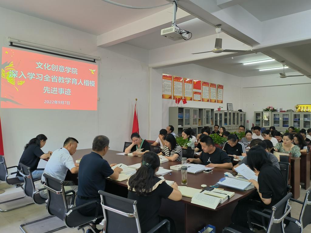 9月7日下午,文化创意学院组织召开2022年度全省教书育人楷模先进事迹专题学习会,会议由党总支书记张克主持,全体教师参加学习会议。