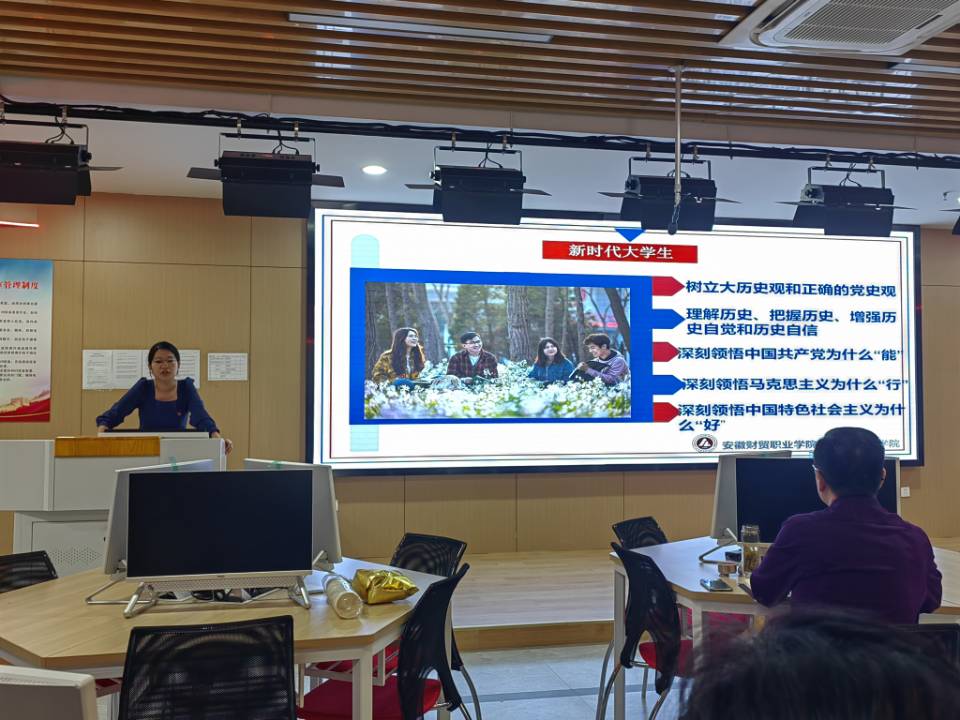 9月21日下午,马克思主义学院在智慧实训室开展特色活动“青年教师说”第三期。会议由马克思主义学院副院长崔学明主持,青年教师陈媛媛主讲,马院全体教师参会。