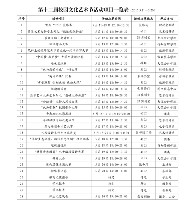 近日,学院确定了第十二届校园文化艺术节的举办时间,5月11日开幕,5月20日闭幕,前后历时10天。本届艺术节的主题是“传承徽商文化,服务社会转型”。