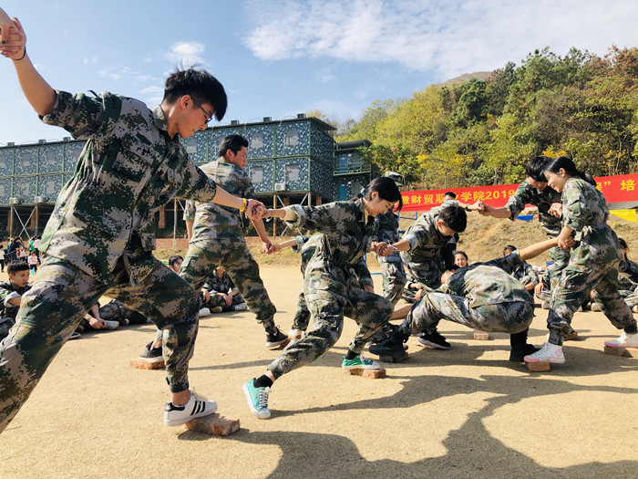 上午的训练项目有“沙场点兵”和“携手共进”,“沙场点兵”通过军事化的训练,帮助同学们树立规矩意识,通过共同完成队旗、队歌、口号的设计,打破同学们之间的隔阂,消除扭捏,让同学们快速的认识到团队的重要性。“携手共进”要求同学们手牵手,依次通过摆放在地面的13块砖,游戏要求同学们必须有充分的沟通与合作才能保证团队顺利的完成项目。