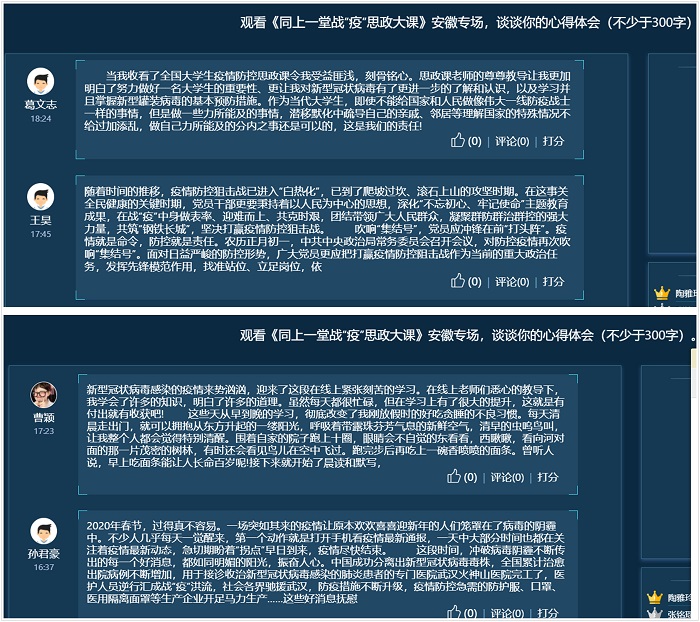 主题课堂中,思政课老师们和同学们线上互动交流了观看视频课的收获和体会,同学们表示,安徽省援鄂医疗队在支援湖北抗疫中做出了卓越的贡献,他们贡献了聪明才智、贡献了无限爱心,彰显了鄂皖两省比邻而居、守望相助的深厚感情。同学们反复提到了岁月静好只因总有人在替我们负重前行,应该时刻抱有危机意识,当前努力学习,日后努力工作,用心用行来报效祖国。酒店1901班彭丽丽同学说“这场疫情再次论证了人类命运共同体的科学论断,再次彰显了社会主义制度的优越性,再次展示了中华儿女面对重大灾难时众志成城的民族力量,我为身在这样的祖国、这样的民族、这样的文化中而倍感自豪和庆幸。我们要化感恩为动力,坚定理想信念,为实现民族复兴而不懈努力。”