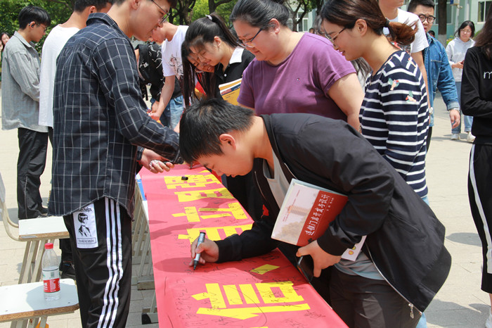 近日,学校第六届学生资助诚信教育主题月活动拉开帷幕,由学生处组织的大型签名仪式在西教学楼宣传栏前举行,过往同学纷纷在印有“诚实守信、自立自强、励志成才、报效祖国”的横幅上签名留言,许下自己诚信自强的诺言。
