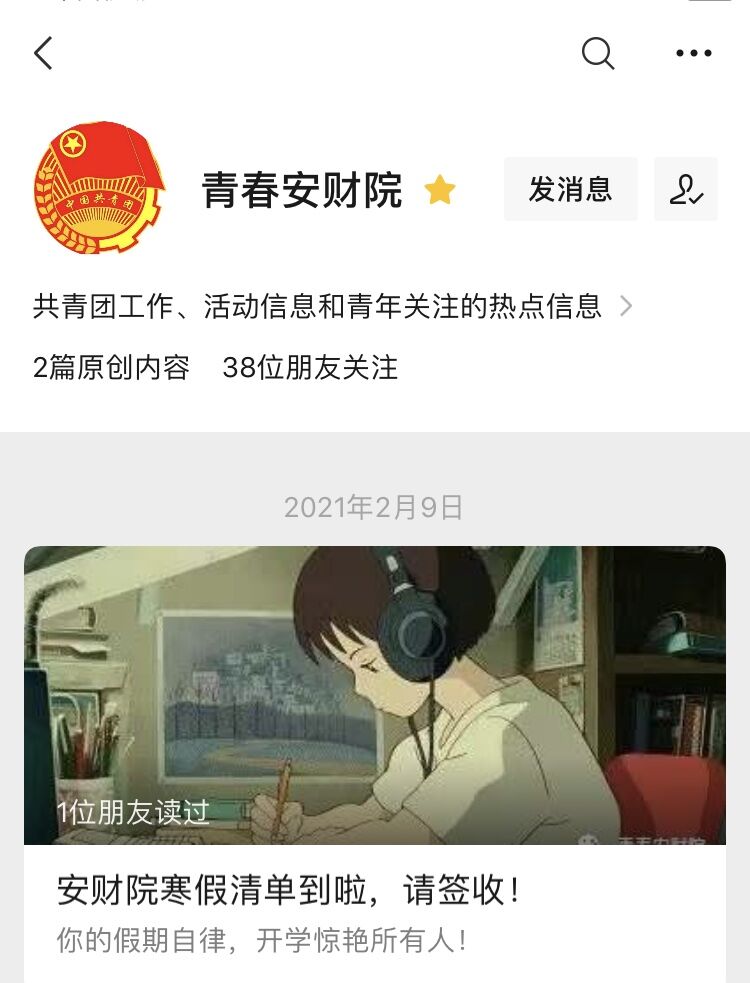 微信公众号“青春安财院”推出《致广大师生的一封信》,提醒同学们假期居家仍要筑牢疫情防控的警惕线,严格落实防控要求,做好自我和家人安全防护;同时,公众号通过发布《安财院寒假清单》鼓励同学们假期仍要合理利用时间,科学安排假期学习计划,做到不负韶华,奋力进取。