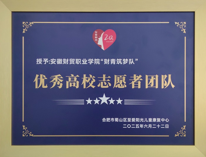 近日,财会金融学院“财青筑梦队”志愿服务团队凭借在关爱孤独症儿童工作中的突出表现,荣获合肥市蜀山区至爱阳光儿童康复中心授予的“优秀高校志愿服务团队”称号,其多年来以爱心与专业助力孤独症儿童成长的行动获高度认可。