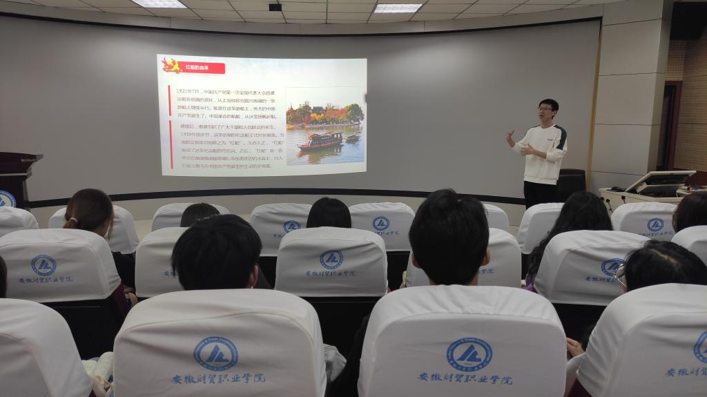 孙峻峰以“中国共产党诞生”为话题开篇,从“弘扬‘红船精神’走在时代前列”“ ‘红船精神’党的先进性之源”“‘红船精神’ 的先进性建设”“继承和弘扬‘红船精神’”四个方面阐述“红船精神”的内涵以及“红船精神”的重要性和先进性。孙峻峰表示,“红船精神”是开天辟地、敢为人先的首创精神,坚定理想、百折不挠的奋斗精神,立党为公、忠诚为民的奉献精神,是中国革命精神之源。面对新挑战、新机遇和新形势、新任务,要坚持和发扬“红船精神”,与时俱进,开拓创新,争做新时代合格团员,不断推进建设中国特色社会主义的伟大事业。