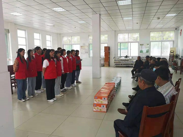 五月的阳光,温暖和煦,下午2时许,师生们顺利抵达肥东县光荣院。在活动大厅,98岁高龄的革命老兵张圣开老人为大家讲述了参加渡江战役、广东曲江战役和抗美援朝的战斗青春和坎坷经历,老人生动的讲述将在场师生再次带入那个炮火纷飞革命战争年代,重温那段刻骨铭心而波澜壮阔岁月,师生们对革命前辈的英勇事迹深深感动,接受了一堂教育意义深刻的“党课”。随后,学生志愿者现场带来了大合唱《映山红》、诗歌朗诵《红军颂》等节目,表达对革命老战士的崇高敬意,对伟大祖国的真挚热爱。党员教师和学生志愿者们为光荣院的每一位老人送去牛奶、蛋糕等慰问品,并在交谈中关心着老人们的晚年生活。