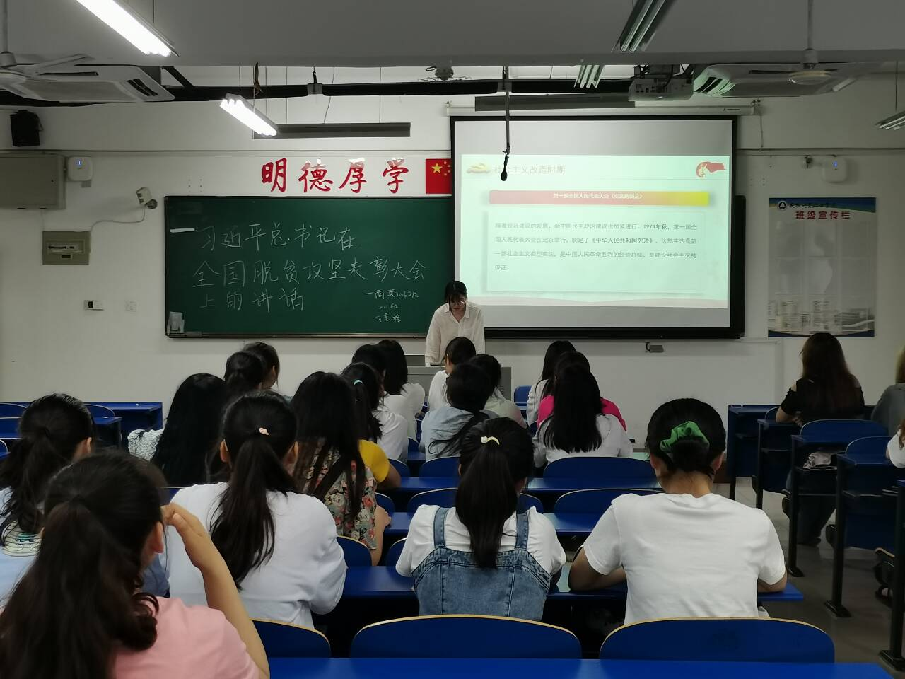 宣讲团成员们走进各班,向同学们开展宣讲活动。成员们从党史学习教育的重大意义讲起,带领学生回顾中国共产党的百年奋斗历程,从新民主主义革命时期到社会主义革命和建设时期,再到改革开放和社会主义现代化建设时期,中国共产党从风雨飘摇中走来,走向如今的光辉灿烂。宣讲团对百年党史的基本脉络、党史发展的三个阶段、深入了解习近平新时代中国特色社会主义思想、中国梦的核心目标及实现路径等问题进行了认真的宣讲。