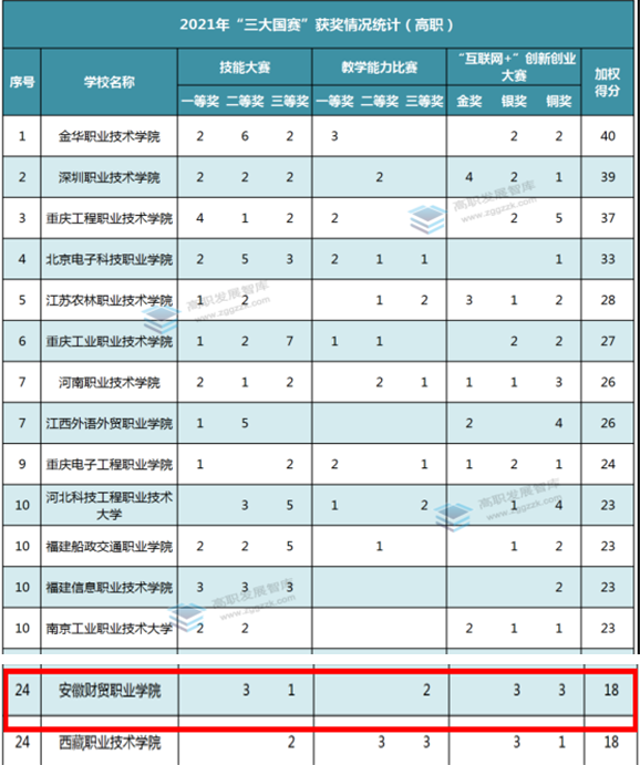 近日,高职发展智库对2021年全国职业院校技能大赛、全国职业院校技能大赛教学能力比赛、“互联网+”大学生创新创业大赛等“三大国赛”公示名单进行了统计,我校在“三大国赛”中共获奖12项,成绩位列全国第24位、安徽省第1位。