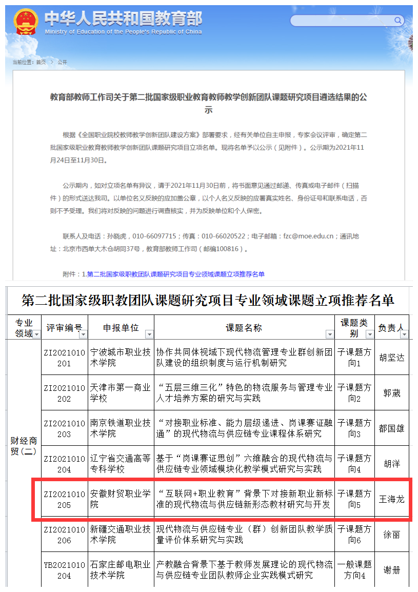 近日,教育部公布了第二批国家级职业教育教师教学创新团队课题研究项目立项名单。我校王海龙教授主持的《“互联网+职业教育”背景下对接新职业新标准的现代物流与供应链新形态教材研究与开发》成功入选国家级职教团队课题研究项目。