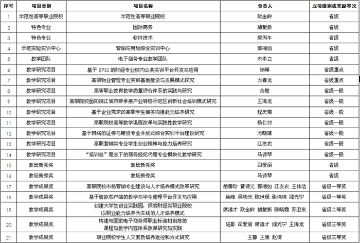 日前,在省教育厅公布的2010年高等学校省级教学质量与教学改革工程项目名单中,学院取得包括示范性高等职业院校在内的21项成果,位居全省同类高校前列。