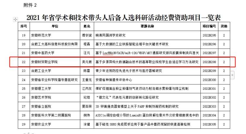 近日,2022年度安徽省学术和技术带头人及后备人选科研活动经费资助项目名单正式公布,全省共择优资助35个项目。其中,吴元君教授《基于多源异构大数据融合技术的高等职业院校学生自适应学习方法研究》项目获批立项,是我省高职院校唯一入选的项目。