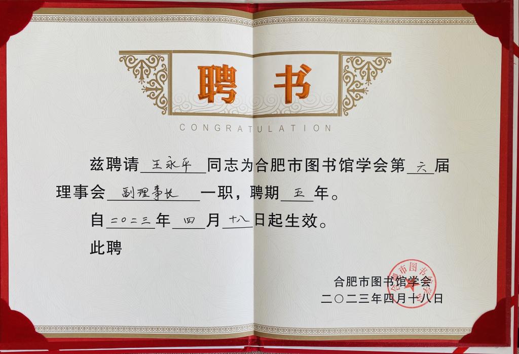 合肥市图书馆学会理事会成员均为合肥市各大公共图书馆馆长、高校图书馆馆长等图书馆领域专家学者,本次当选,体现了学校图书馆坚持“融入社会、服务社会、贡献社会”原则,加强了学校图书馆的群众性、服务性和导向性,扩大了学校图书馆的社会影响力。学校图书馆将继续做好各项教科研服务工作,积极为学校高水平大学建设添砖加瓦。(供稿:宣融融 审稿:王永平)