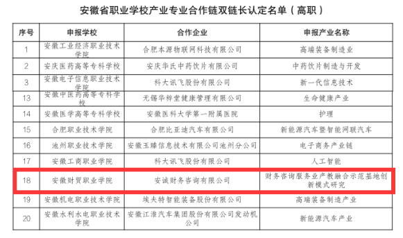 近日,安徽省教育厅印发《安徽省教育厅关于公布安徽省首批“六百工程”项目名单的通知》,我校徐明老师入选“安徽省职业学校江淮职教名师”、学校与安诚财务咨询有限公司合作的“财务咨询服务业产教融合示范基地创新模式研究”入选“安徽省职业学校产业专业合作链双链长”。