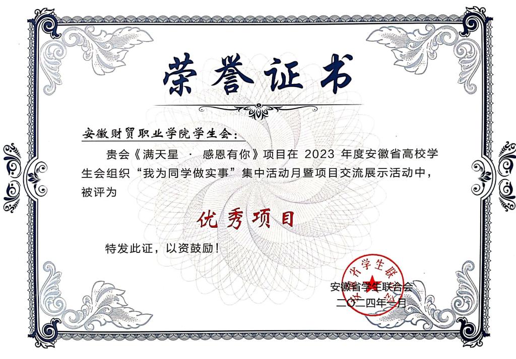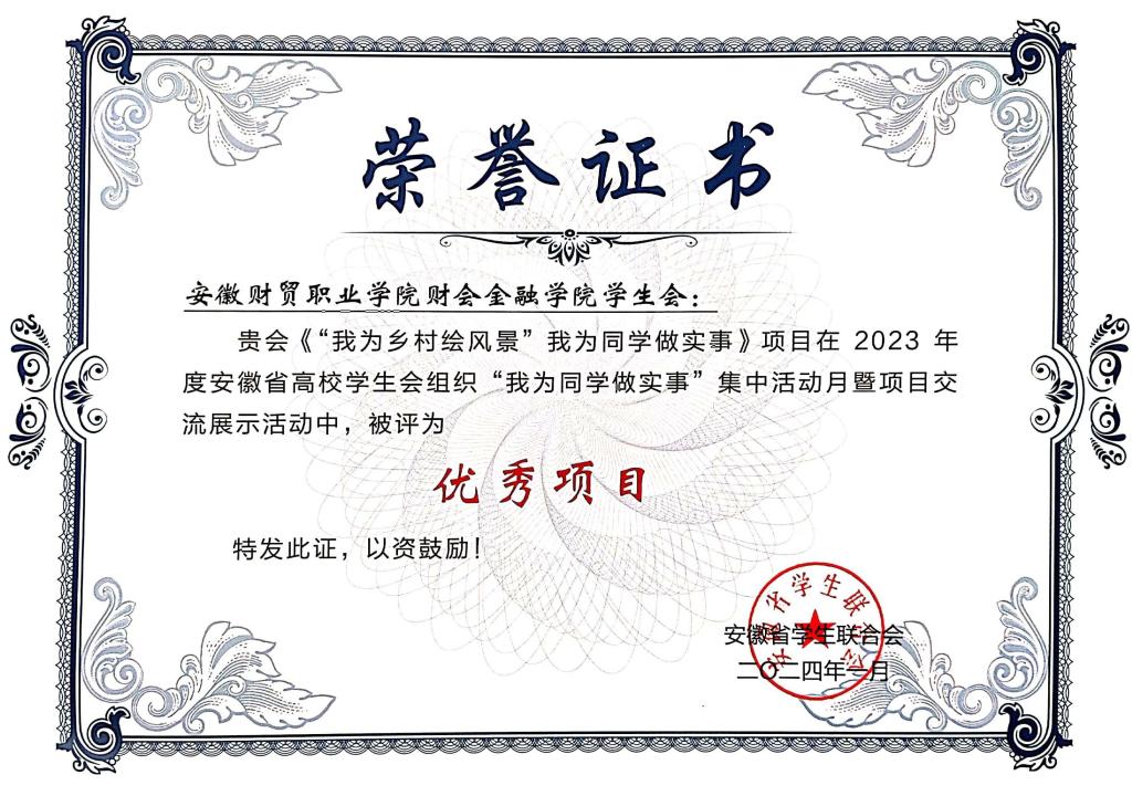 学校学生会“满天星·感恩有你”我为同学做实事项目,以文体活动为基础打造我校青年学子展现风采的平台,传承安财院文化活动品牌,加强学院体育美育工作建设。财会金融学院学生会“我为乡村绘风景”我为同学做实事项目,携手长丰马郢村“万马奔腾”联合策展活动开创“我为乡村绘风景”主题系列策展活动,并接收当地多家媒体采访、中国青年网、安徽日报等官媒报道,及央视直播采访,为广大青年学生提供丰富多彩的实践平台。