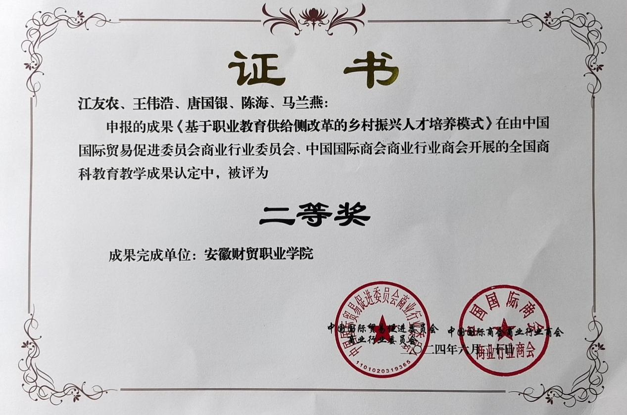近日,在中国国际贸易促进委员会商业行业委员会和中国国际商会商业行业商会举办的2024年商科教育教学成果评选中,由我校教师江友农、王伟浩、唐国银、陈海、马兰燕提交的《基于职业教育供给侧改革的乡村振兴人才培养模式》荣获二等奖。本次成果奖评选是为进一步推动我国商科教育领域专业课程体系和教育教学方法的改革,展示我国商科教育领域取得的优秀教学成果。