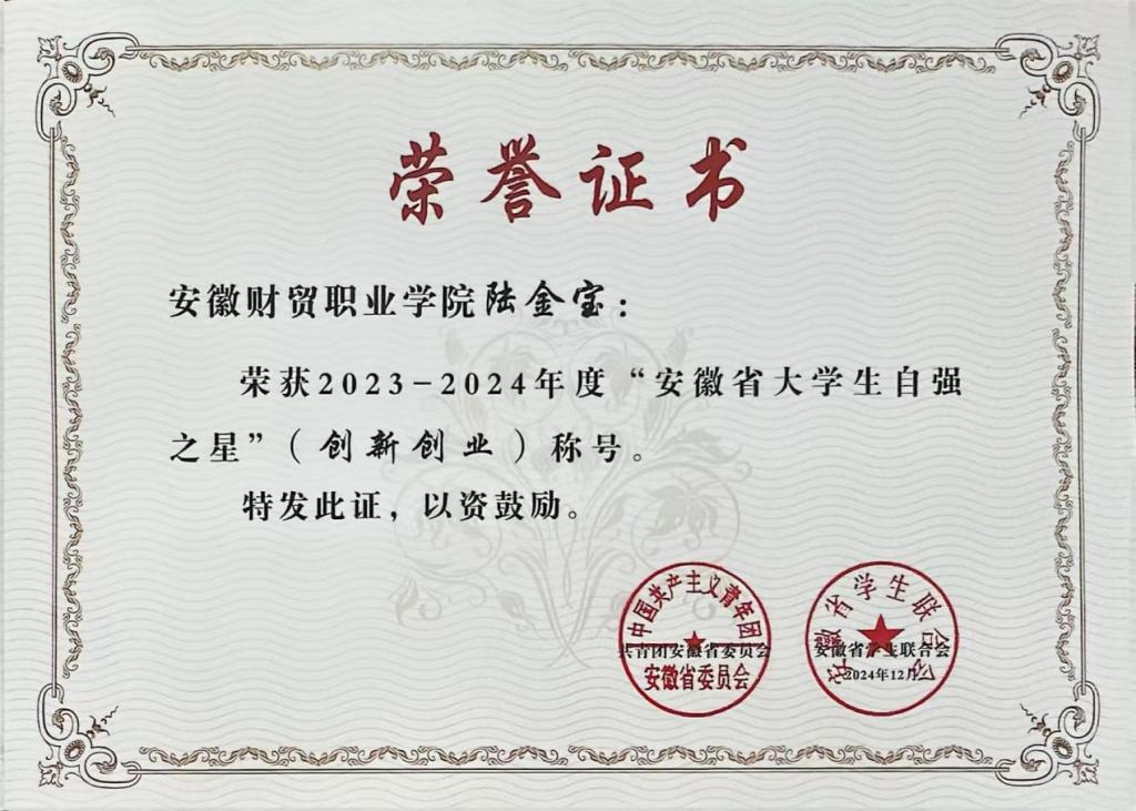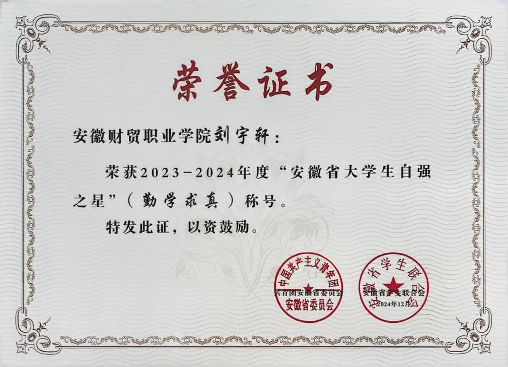 2023—2024年度“安徽省大学生自强之星”寻访活动以“自信自强 挺膺担当”为主题,旨在表彰在学业、科研、创新创业等方面表现突出的优秀大学生,激励广大青年学生自强不息、奋发有为。此次获奖,不仅是对他们个人努力和成就的肯定,也是对学校教育质量和人才培养工作的认可。(供稿:胡其枫 审稿:刘成 廖步岩)
