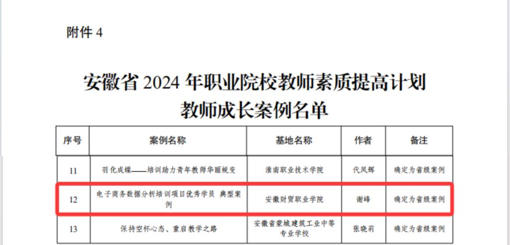 近日,安徽省教育厅公布2024年职业院校教师素质提高计划优秀学员典型案例名单,我校经济贸易学院专任教师谢峰参加安徽省2024年职业院校教师素质提高计划国家级培训高职项目电子商务数据分析项目,成功入选教师成长典型案例名单。