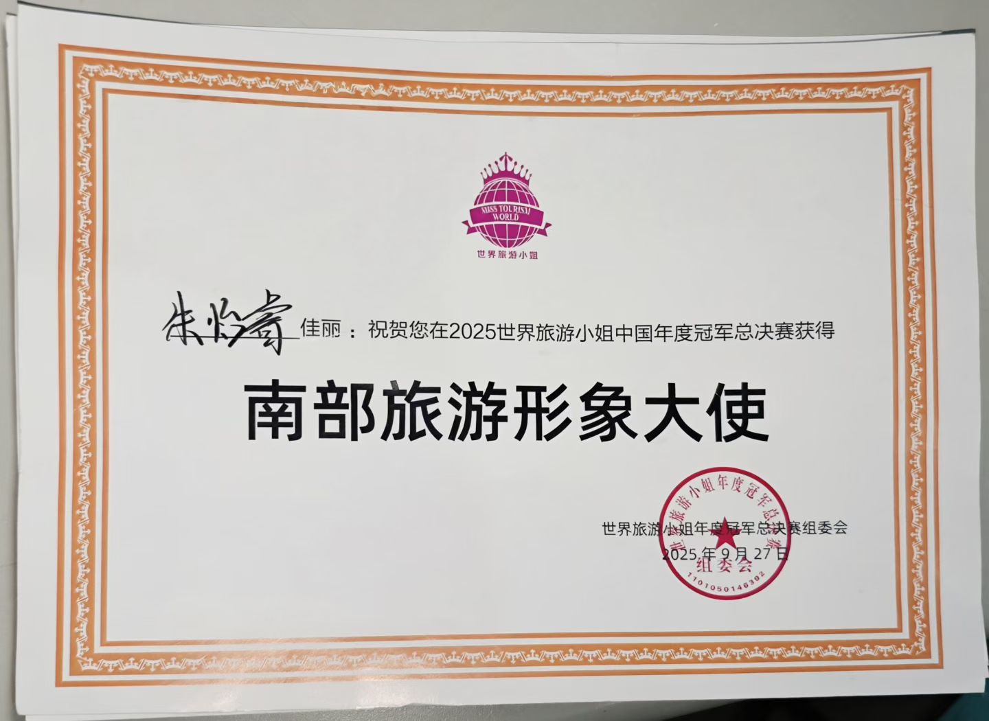 9月27日,2025世界旅游小姐中国年度冠军总决赛在安徽淮南落幕,我校大数据与会计专业2405班学生朱怡睿凭借出色表现斩获“南部旅游形象大使”称号。