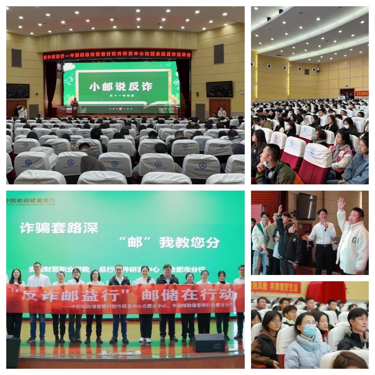为深入贯彻落实党的二十大精神和党中央决策部署,积极响应中央宣传部、公安部“全民反诈在行动”集中宣传月活动号召,学校联合邮储银行软件研发中心合肥分中心、邮储银行合肥市分行,于11月15日开展“反诈邮益行,安全共筑建”志愿活动,助力在校学生提升“识诈反诈”意识,共筑校园“无诈净土”。